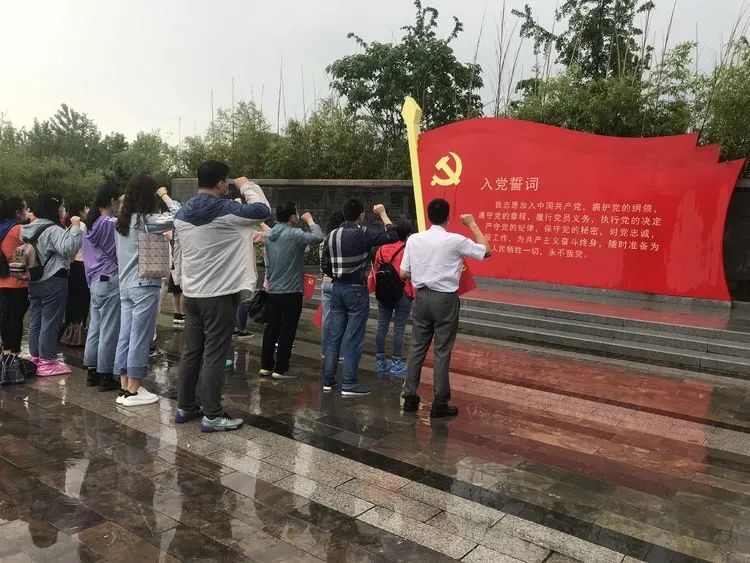 到達小崗村後,雨越下越大,卻絲毫沒有削減黨員們的參觀學習熱情。大家先去了沈浩書記墓地,在這裡開展黨史學習教育活動。