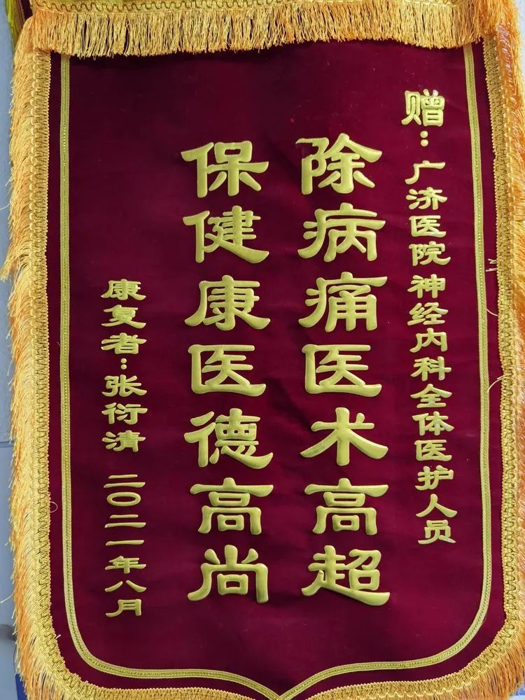 經過積極的治療,邱老師症狀好轉,視野缺損也得到改善。康複出院之後,給科室送來一面錦旗:“除病痛醫術高超,保健康醫德高尚”。