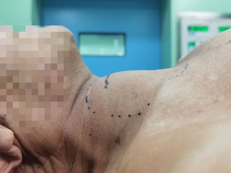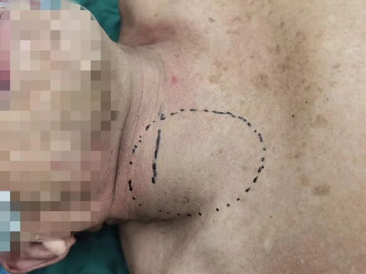 年近八旬龔老兩年前在外院确診骶骨腫瘤時發現頸部甲狀腺結節,起初老人并未重視,後來,該頸部包塊不斷增長,并于近期增大明顯。巨大的腫瘤逐漸墜入其上縱隔,對其大氣道造成壓迫,迫使其氣道受壓左移,老人伴有出現呼吸不暢、聲音低鈍、吞咽不适等一系列症狀。