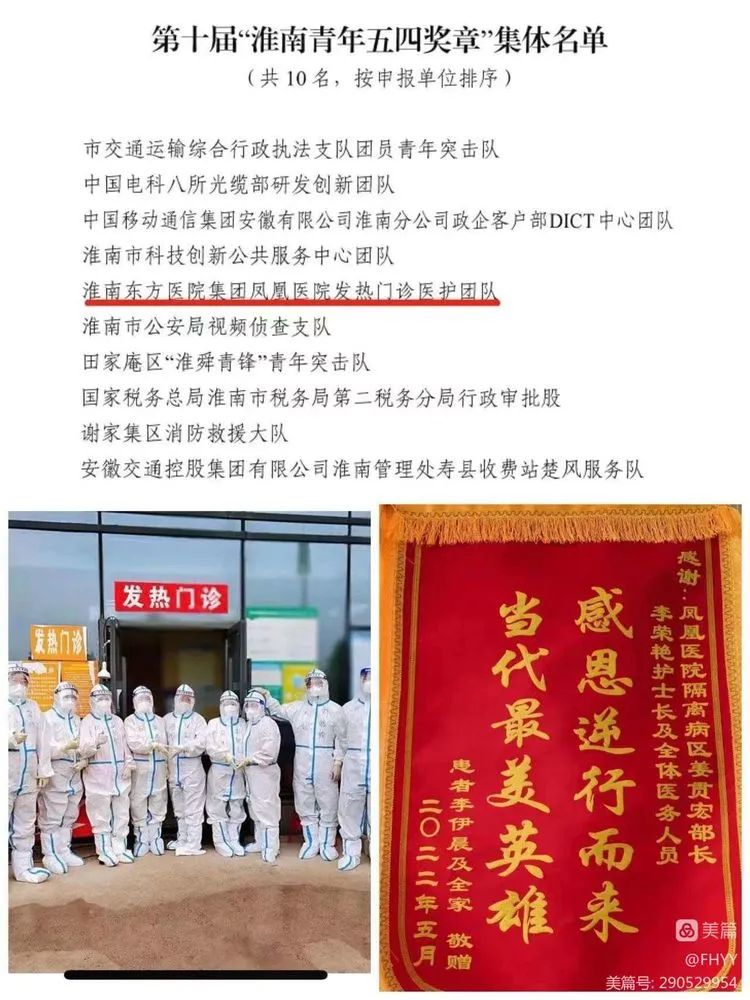 在疫情面前,鳳凰醫院發熱門診承擔着防控疫情的重要使命,發熱門診全體成員責無旁貸,徹夜奮戰。在醫院集團共青團的支持下,參選并榮獲了第十屆“淮南青年五四獎章”。現今,黨員李榮豔護士長接過了發熱門診的接力棒,繼續帶領隊員們在疫情防控最前線奮鬥。
