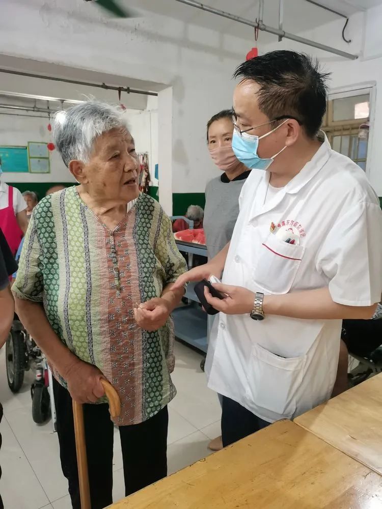 一到養老院,院領導和支部的黨員們紛紛走到老人們身邊,為老人測量血壓、血糖,接受老人和護工們的健康咨詢。得知有卧床老人胃腸道不适,需要到床邊查看,代坤同志立刻走到老人床前,為老人仔細查體問診。