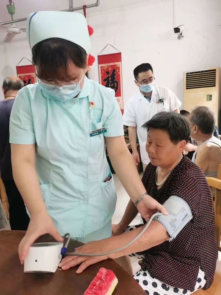 “奶奶,血壓116/67mmHg,挺好的。咱們夏天熱血管舒張,所以血壓會比冬天低,您血壓正常。”黨員朱晨迪一邊給老人們測血壓一邊耐心解說。