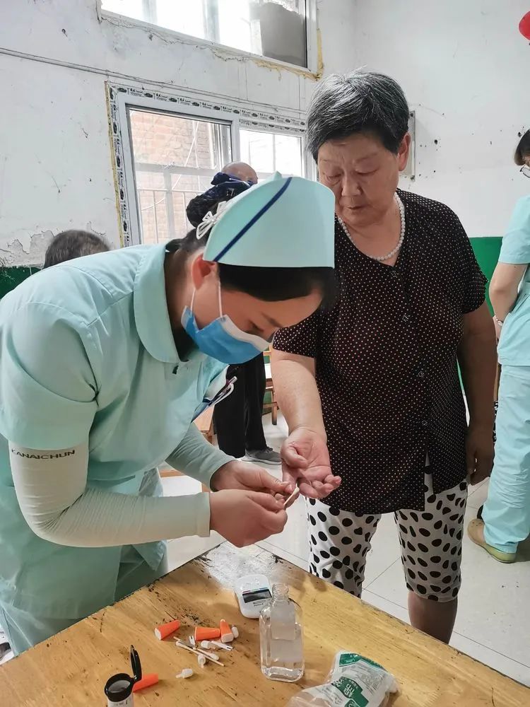除了給老人們測量血壓,另一邊黨員吳慶芝在為老人們測量血糖,“大爺,早晨吃過飯沒有。您手指給我,好的。”