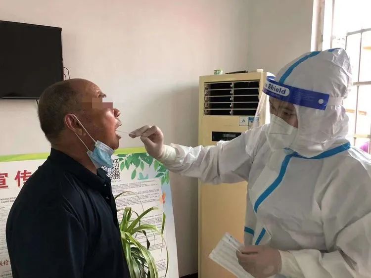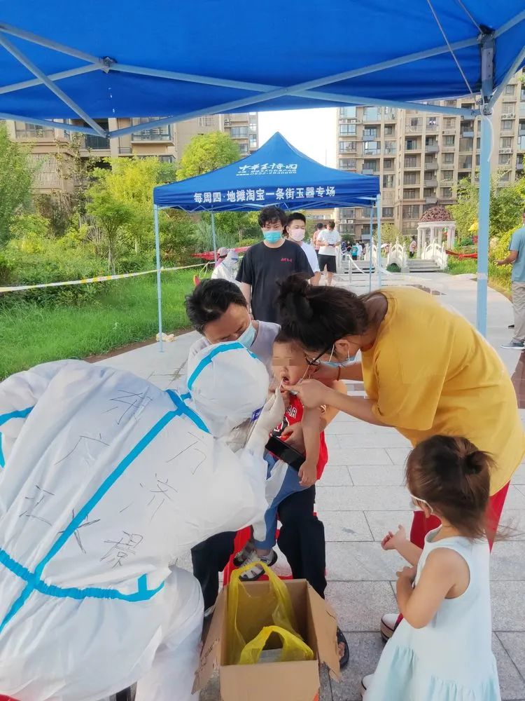 正在采樣的是隊裡的段夏夏和桂钰,她們的頭上沒有一點遮擋,最高氣溫41℃的戶外,每一個穿着防護服采樣的大白都在挑戰身體的極限。她趕緊上前,一起幫忙采樣。取出棉簽、旋轉咽拭子,放進試劑管、壓斷棉簽,不遠處的采樣點又有人倒下,然後别的點完成的同事像她一樣被喊來支援,她看到隊裡的王春晖也來了,這個不愛說話的同事,喜歡一個人坐在角落裡安靜的看手機,每天回去最晚的總是他。隊裡的三個男生,每一次分任務,都挑最重的去。
