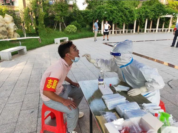 坐在簡易的鐵皮棚裡,他和同事開始為居民采樣,悶熱超出預期,汗不停的順着後背流進腰部,最麻煩的是臉上的汗,一旦滴在眼睛上,不得不用力眨眼才能繼續幹活。一次次擡起手臂、消毒、采樣,一次次大聲的喊“請張嘴”、“謝謝”,體力逐漸消耗。當天晚上7點四十,他們完成了采樣工作,後來他們才知道,這是後來幾天的支援中,結束最早的一天。