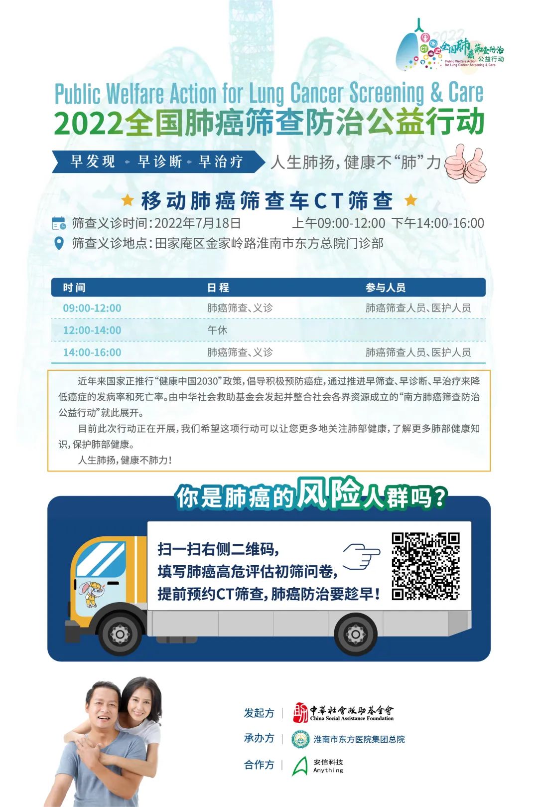 為切實降低癌症的發病率和死亡率,幫助肺癌早篩查、早診斷、早治療,由中華社會救助基金會主辦,淮南東方總院承辦的“南方肺癌篩查防治公益行動”将于7月18日(周一),在東方總院門診部舉行,屆時将通過移動肺癌篩查車對100位報名者進行免費的CT篩查,同時還将開展大型義診活動,幫助人民群衆對肺癌的篩查防治有更進一步的了解,同時幫助提高疾病高發人群早篩早治的意識,為大衆提供更高效、更精準、更便捷的醫療健康服務。